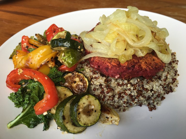 It’s beetroot patty again as you can tell but instead of having it in sandwich or burger, I am having it with roasted vegetables and caramelised onion (doesn’t look quite caramelised) but still taste good.