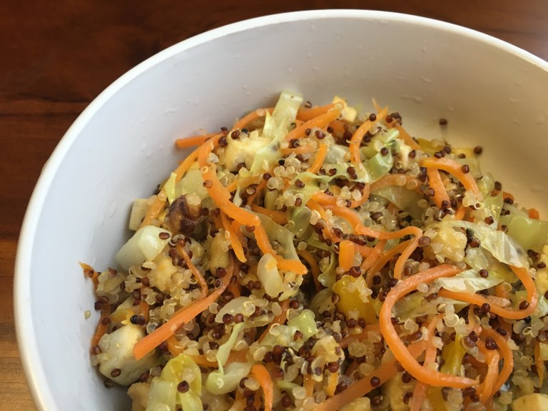 - Saute the carrots and cabbage, once soften, add in the cooked quinoa and tofu. Mix them up well.